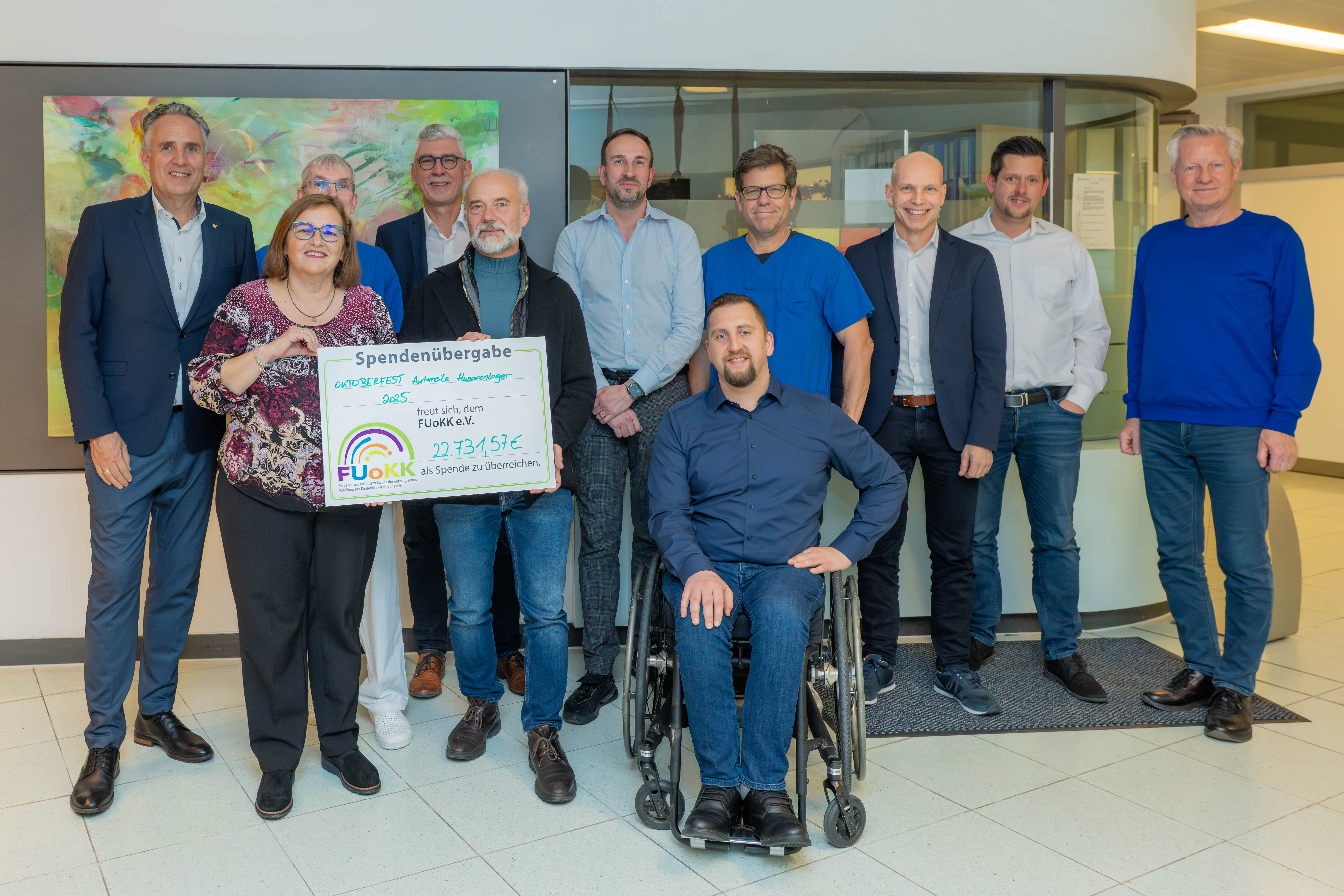 Seit mehr als 20 Jahren veranstalten die Unternehmen der Automeile Husarenlager in Karlsruhe im Herbst ihr traditionelles Oktoberfest mit einem bunten Programm. Die Erlöse der Tombola sowie Spenden der mitwirkenden Unternehmen gehen dabei seit jeher an den Förderverein zur Unterstützung der onkologischen Abteilung der Kinderklinik Karlsruhe e.V. (FUoKK). In diesem Jahr kamen mehr als 22.000 Euro zusammen, die Vertreter der beteiligten Unternehmen jetzt im Städtischen Klinikum Karlsruhe offiziell übergeben haben.