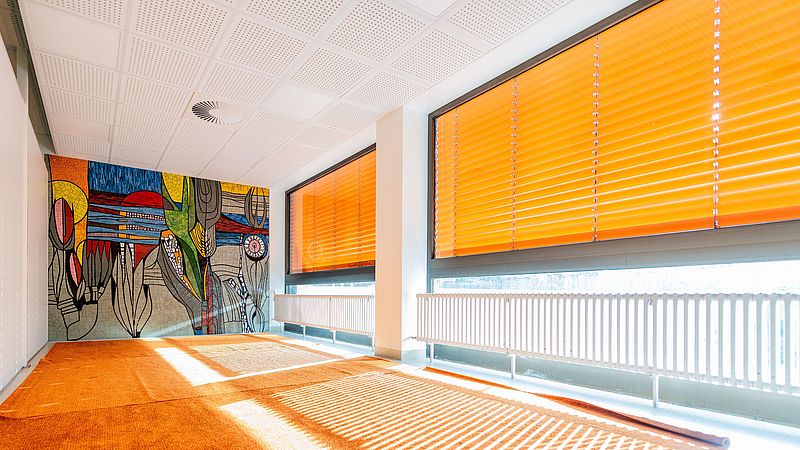 Das Herzstück des Raums ist ein Kunstwerk der Künstlerin Gabriele Wilpers: eine skulpturale, freistehende Wand, die die Besucherinnen und Besucher mit ihrer Wellenform symbolisch mit offenen Armen empfängt.