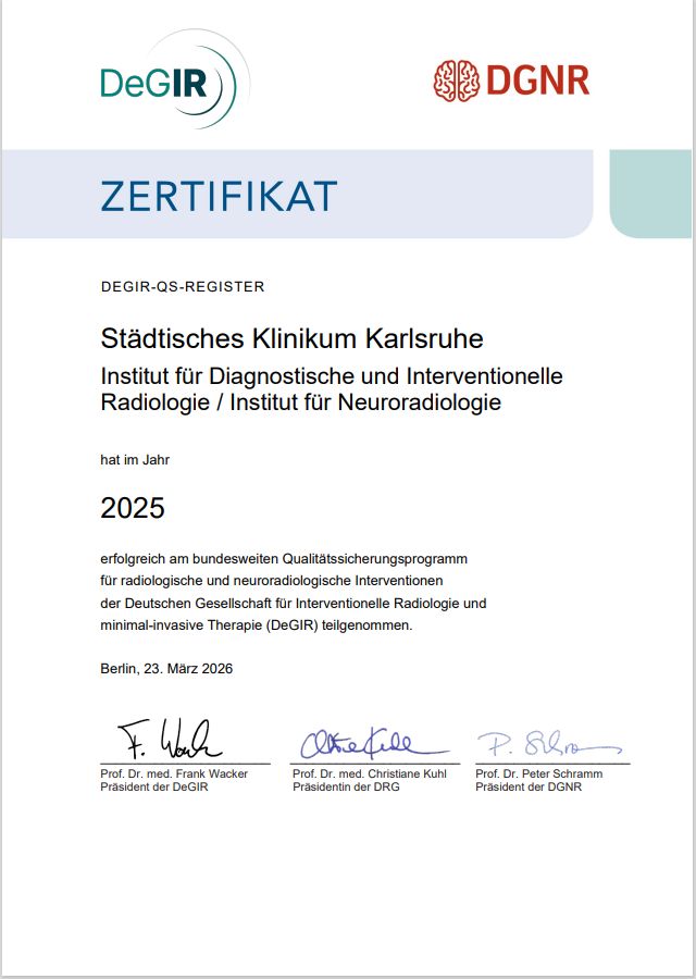 Das Institut für Diagnostische und Interventionelle Radiologie/ Institut für Neuroradiologie hat im Jahr 2025 erfolgreich am bundesweiten Qualitätssicherungsprogramm für radiologische und neuroradiologische Interventionen der Deutschen Gesellschaft für Interventionelle Radiologie und minimal-invasive Therapie (DeGIR) teilgenommen.